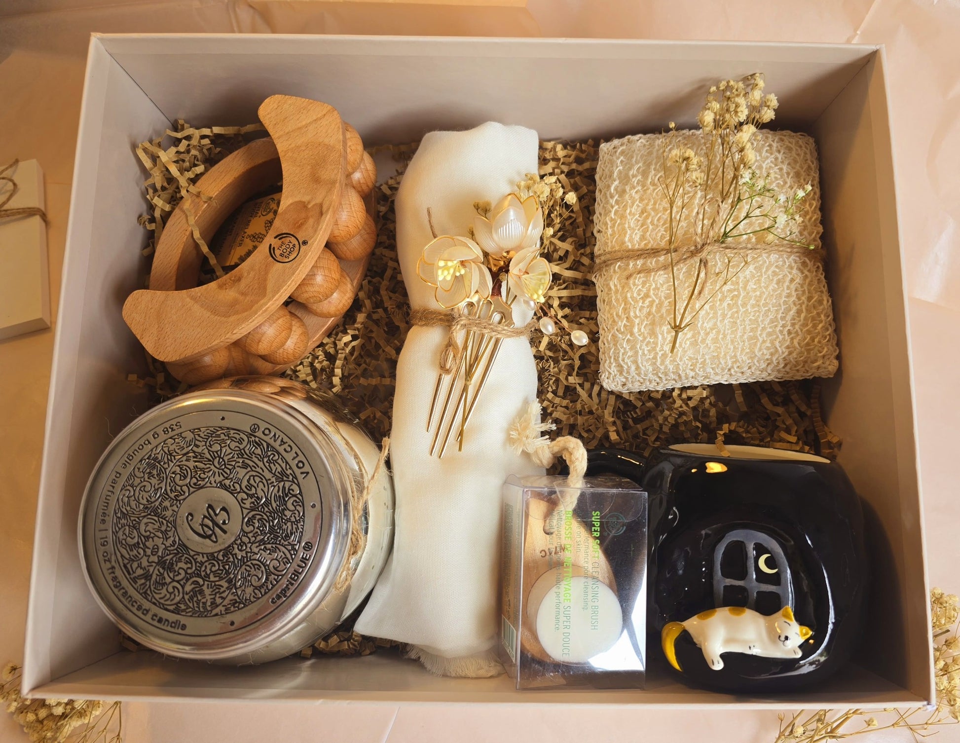 A serene and earthy self-care gift box curated for relaxation and beauty. Ideal for new mums or anyone who deserves a little pampering, this hamper blends practicality with charm.